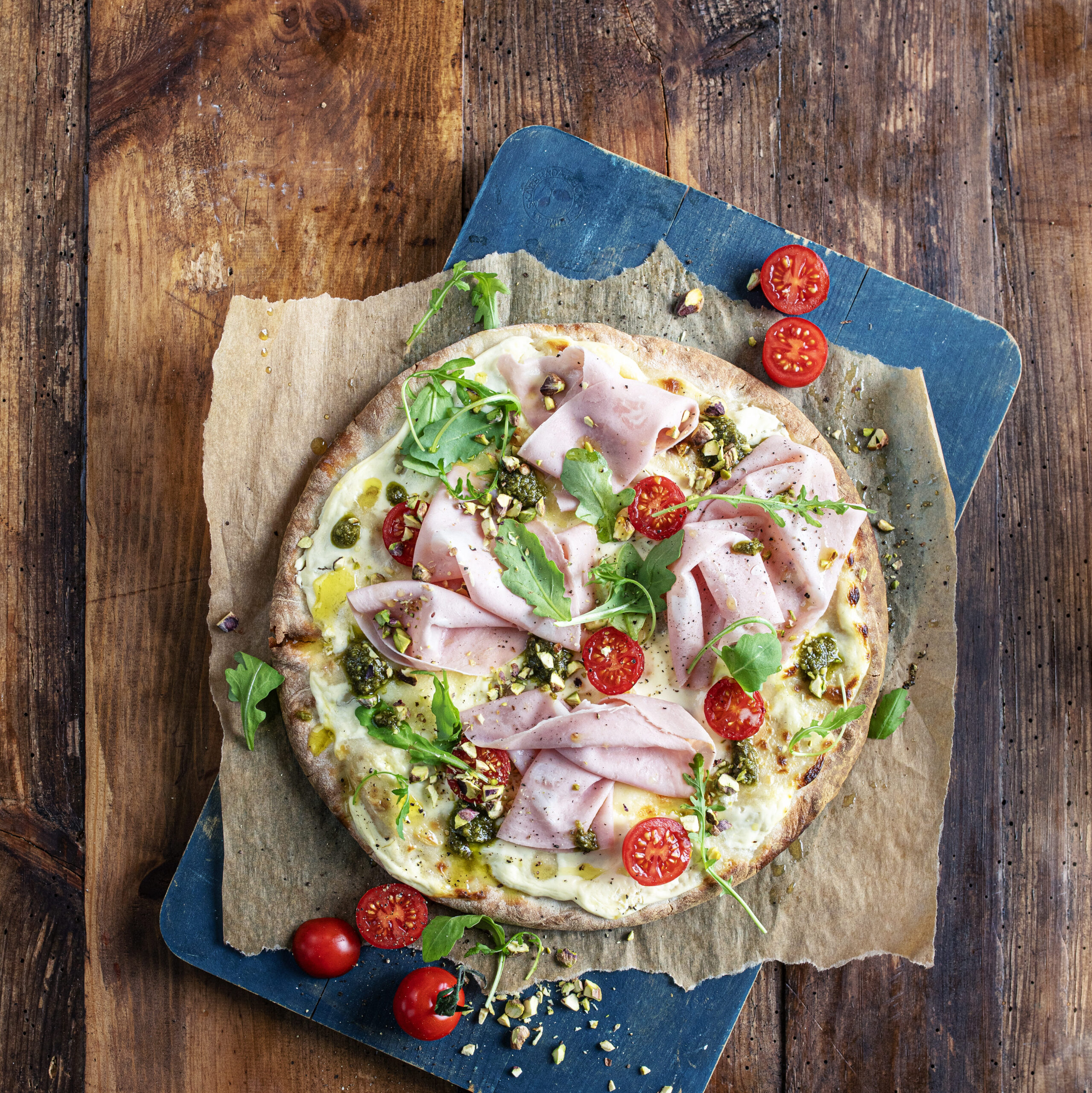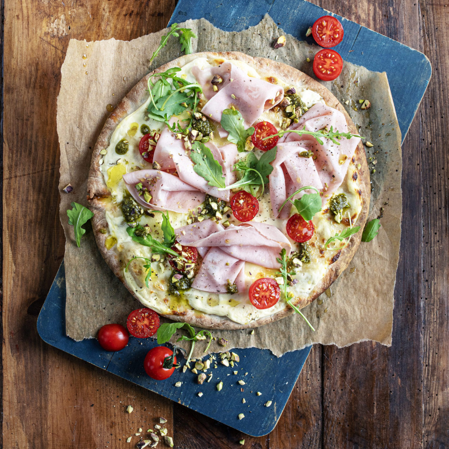 Fordel fersk mozzarella over pizzaen og topp med mortadella, pesto, cherrytomater, hakkede pistasjnøtter og frisk ruccula.
